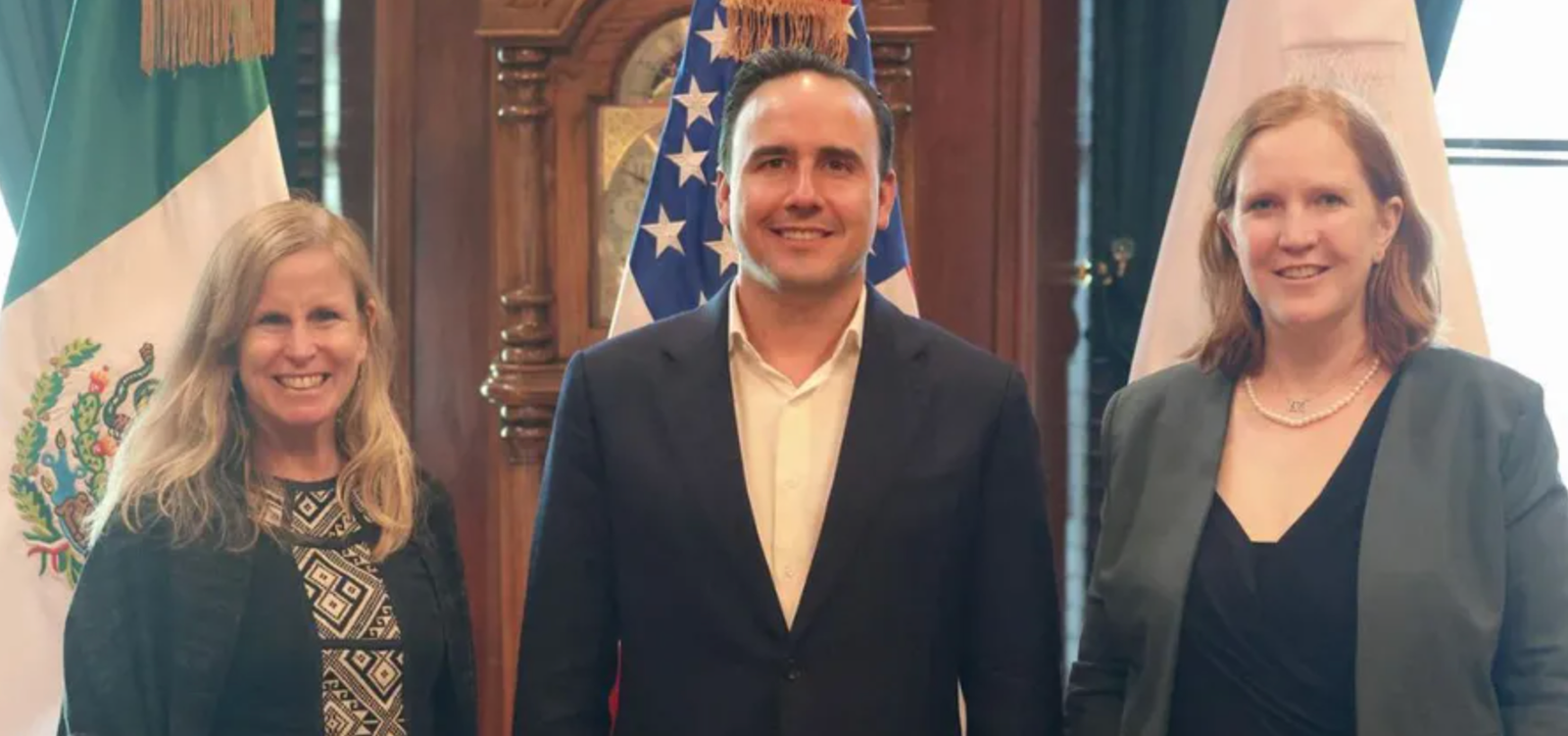 Saltillo, Coahuila.– El gobernador Manolo Jiménez Salinas sostuvo una reunión estratégica con Melissa Bishop, cónsul general de Estados Unidos en Monterrey, y Erika Zielke, cónsul en Nuevo Laredo, para fortalecer la cooperación binacional en temas de seguridad, economía, educación y ganadería.