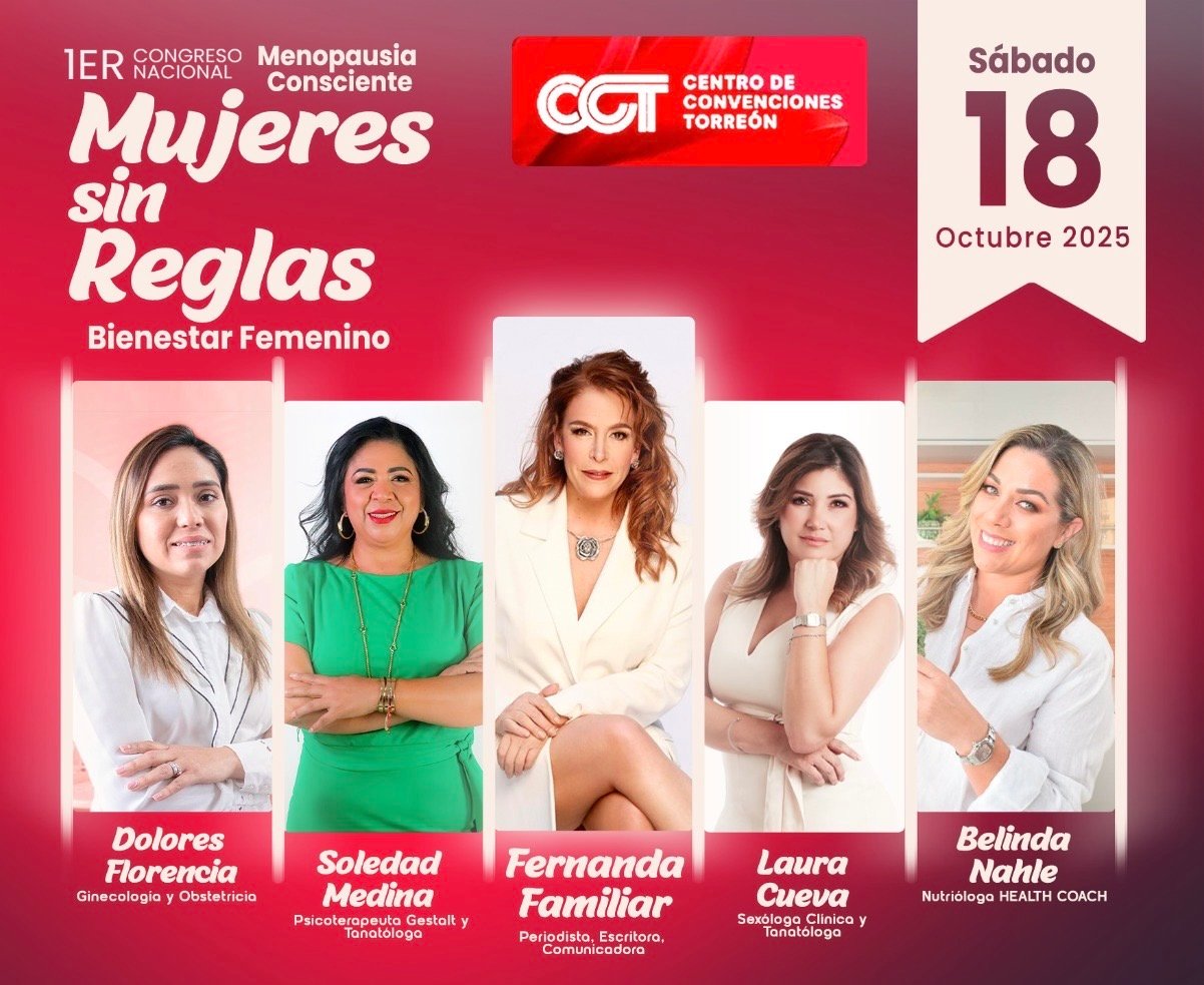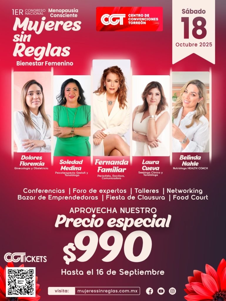 Torreón, Coahuila.– La Comarca Lagunera recibirá un encuentro sin precedentes: el Congreso “Mujeres sin Reglas”. El evento se realizará el sábado 18 de octubre de 2025 en el Centro de Convenciones de Torreón (CCT). Se espera la asistencia de 400 mujeres de entre 38 y 60 años que atraviesan la perimenopausia, menopausia o postmenopausia.
