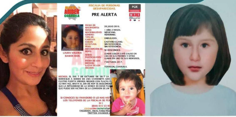 La Fiscalía de Personas Desaparecidas ha emitido una ficha de búsqueda y ofrece una recompensa de 300 mil pesos por información que conduzca a la localización de Liliana Leticia Ríos Villela y su hija menor de edad, Laura Valeria Ramos Ríos. Ambas fueron vistas por última vez el 7 de octubre de 2017 en el municipio de Torreón.
