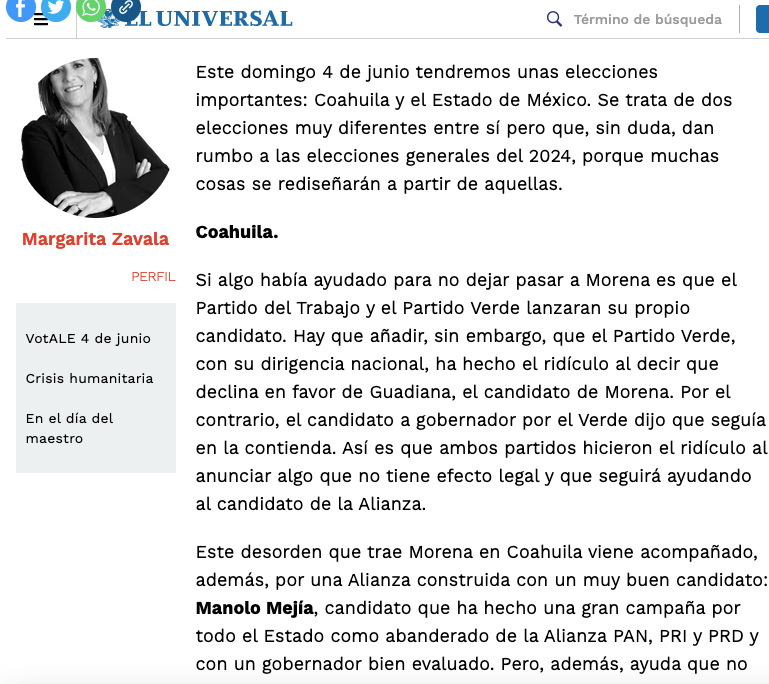 Tal es el caso de Margarita Zavala, esposa del expresidente panista Felipe Calderón (2006–2012), cuyo partido va en alianza con el Revolucionario Institucional (PRI) y el Revolucionario Demócrata (PRD). Sin embargo, a seis días de la contienda electoral nadie le ha informado a la exdiputada que el candidato que tendría que apoyar es Manolo Jiménez y no Manolo Mejía, como lo escribió en su más reciente columna para el periódico El Universal.
