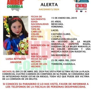 - El 25 de abril, la Fiscalía de Personas Desaparecidas del Estado de Coahuila emitió una Alerta Amber.