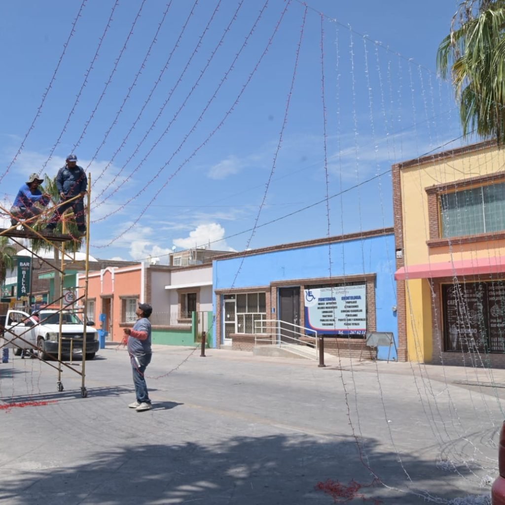 Gómez Palacio, Dgo.– La Dirección de Servicios Públicos Municipales inició este fin de semana los trabajos de instalación de luces y adornos en la calle Independencia, en preparación para las próximas Fiestas Patrias.