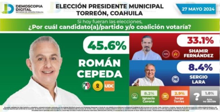 Cabe destacar que Román Cepeda lidera la intención de voto ciudadano en Torreón.