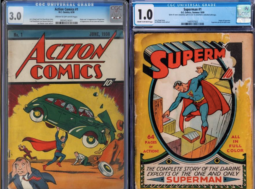 El primero es «Action Comics #1», publicado en junio de 1938 por National Allied Publications -posteriormente DC Comics- que retrata la primera aparición de Superman, basada en una historia de Jeremy Siegel, con una portada ilustrada por Joe Shuster en la que se ve al superhéroe levantando un automóvil verde.