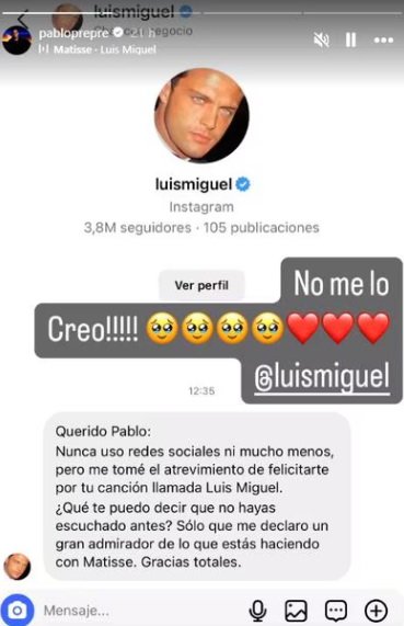 En una revelación emocionante en Instagram, Pablo, también conocido como compositor, compartió una captura de pantalla de su conversación con el legendario «El Sol», acompañada de un mensaje que refleja su incredulidad: «No puedo creerlo».