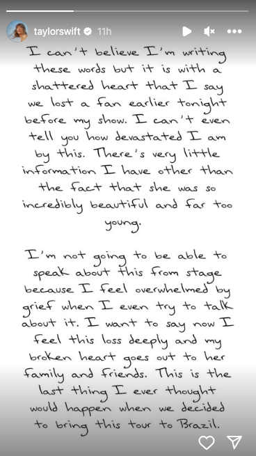 La tragedia ha generado llamados de los fanáticos para mejorar las condiciones en eventos masivos, y las autoridades han abierto una investigación. Aunque Swift continúa con su gira, su mensaje refleja el pesar y la solidaridad con la familia de la fallecida.