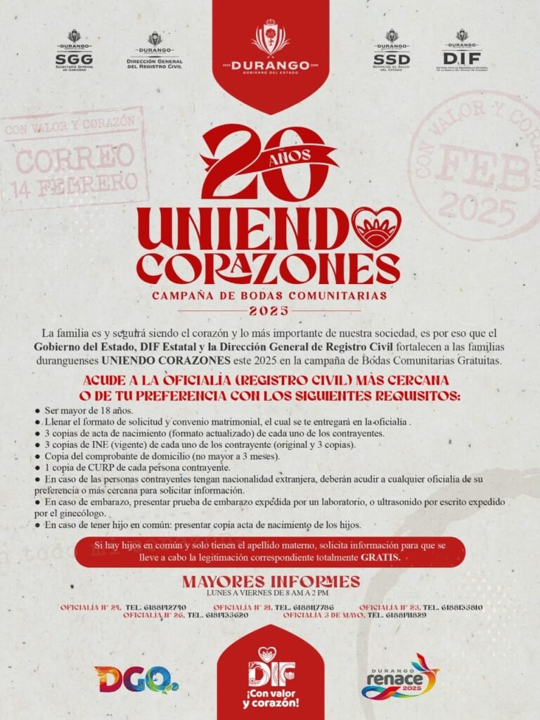Durante el mes de febrero de 2025, el Gobierno del Estado de Durango lanzó el programa “Uniendo Corazones, Campaña de Bodas Comunitarias 2025”, con el objetivo de ofrecer una alternativa gratuita para formalizar las uniones de parejas en la región de La Laguna. La iniciativa, que forma parte de los esfuerzos del Sistema Estatal para el Desarrollo Integral de la Familia (DIF) y la Dirección General del Registro Civil, busca dar certeza jurídica a las uniones y aliviar la carga económica que puede representar el costo de los trámites legales.