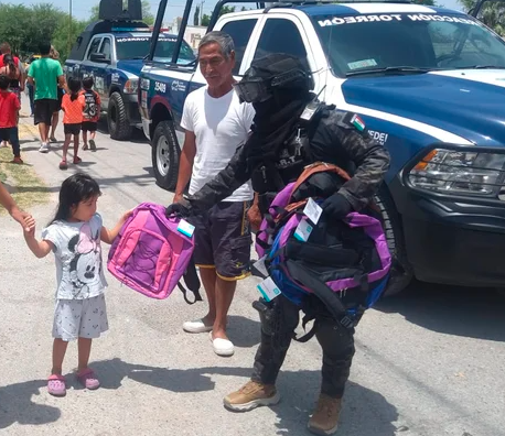 La mañana del domingo, decenas de niños de las colonias del sur y oriente de Torreón recibieron con entusiasmo a los elementos del Grupo de Reacción Torreón (GRT), quienes llegaron para entregar mochilas y paquetes de útiles escolares en vísperas del regreso a clases.