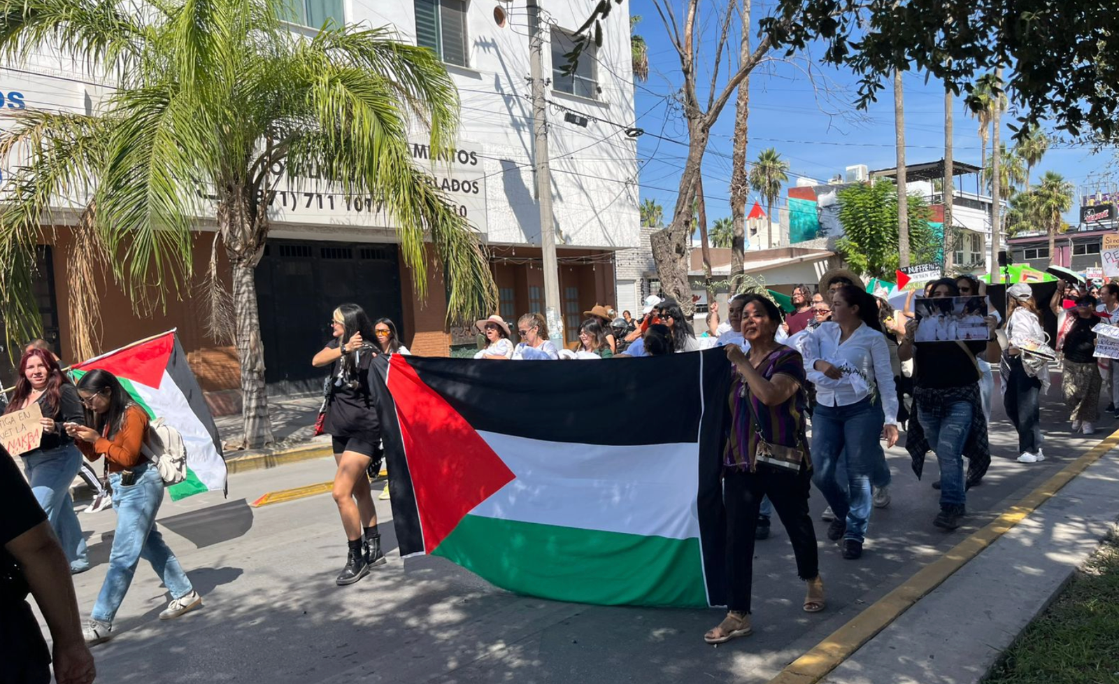 También participaron agrupaciones locales como La Laguna por Palestina, Tribu Noas, Ola Feminista Laguna y Raíces en Resistencia, quienes portaron mantas con mensajes de apoyo a la resistencia palestina.