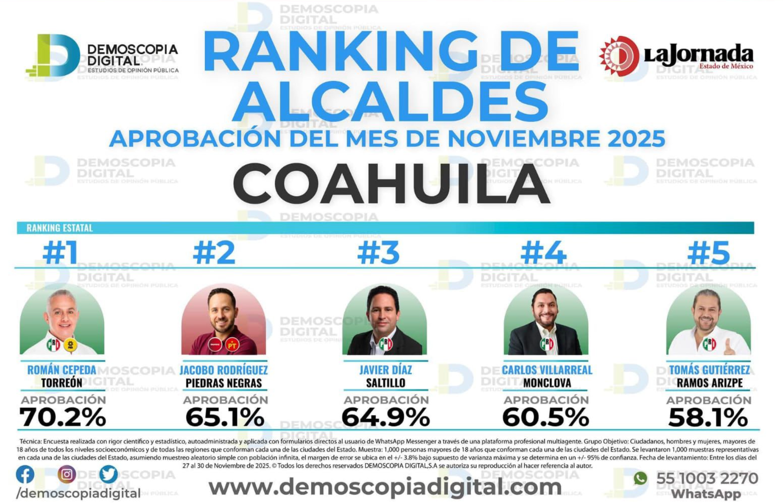 De acuerdo con los resultados, en segundo lugar aparece Jacobo Rodríguez, alcalde de Piedras Negras, mientras que Javier Díaz, de Saltillo, ocupa la tercera posición con un 64.9%. El listado lo completan Carlos Villa Real, de Monclova, con 60.5%, y Tomás Gutiérrez, de Ramos Arizpe, con 58.1%.