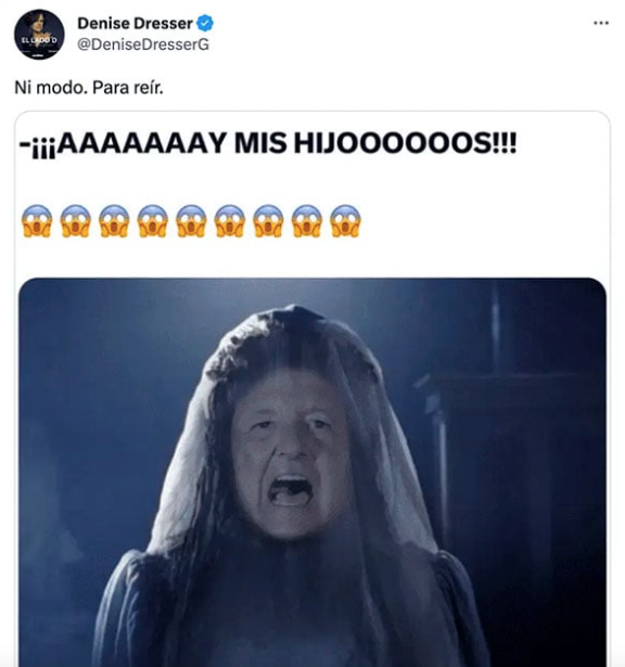El tuit que lanzó la académica contenía un meme en el que el presidente aparece con la silueta de la llorona y la leyenda «ay mis hijos» que compartió el 4 de mayo y le escribió «Ni modo. Para reír».