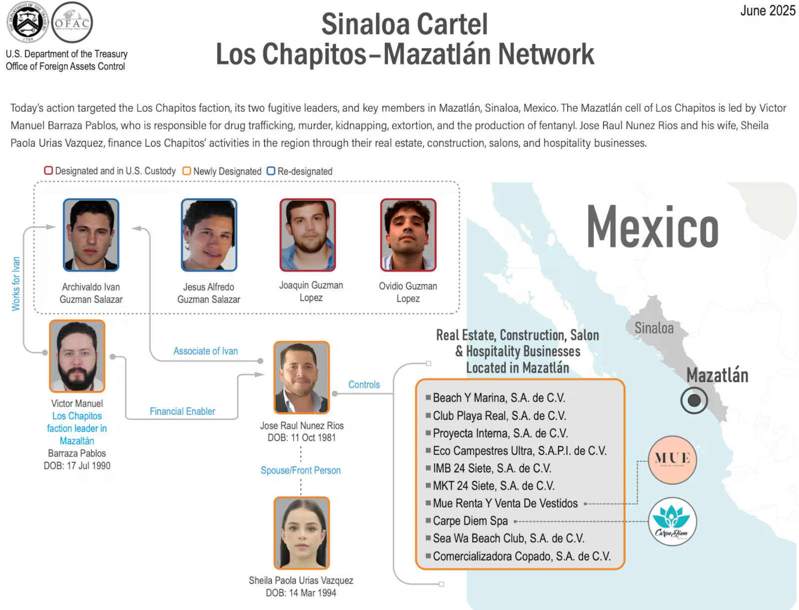 José Raúl Núñez Ríos y Sheila Paola Urías Vásquez construyeron una vida de aparente éxito y emprendimiento en Mazatlán. Él, un abogado convertido en empresario inmobiliario con múltiples desarrollos frente al mar. Ella, influencer de belleza y dueña de un spa de lujo y una tienda de vestidos. Sin embargo, este lunes, el Departamento del Tesoro de Estados Unidos desmanteló la fachada al incluir sus nombres en la lista de sancionados por lavar dinero para el Cártel de Sinaloa, particularmente para la red criminal de Los Chapitos.