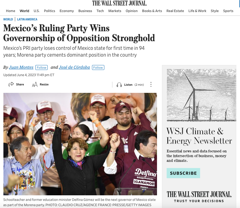 Por su parte, el diario estadounidense The Wall Street Journal remarcó que, por primera vez en 94 años, el PRI ha perdido el control del Estado de México ante Morena, que «consolida su posición dominante» de cara a las presidenciales de 2024, donde las encuestas anticipan que Morena se quedará con la presidencia del país. El PRI, dominante por décadas, ahora sólo controla dos estados, detalla el medio.