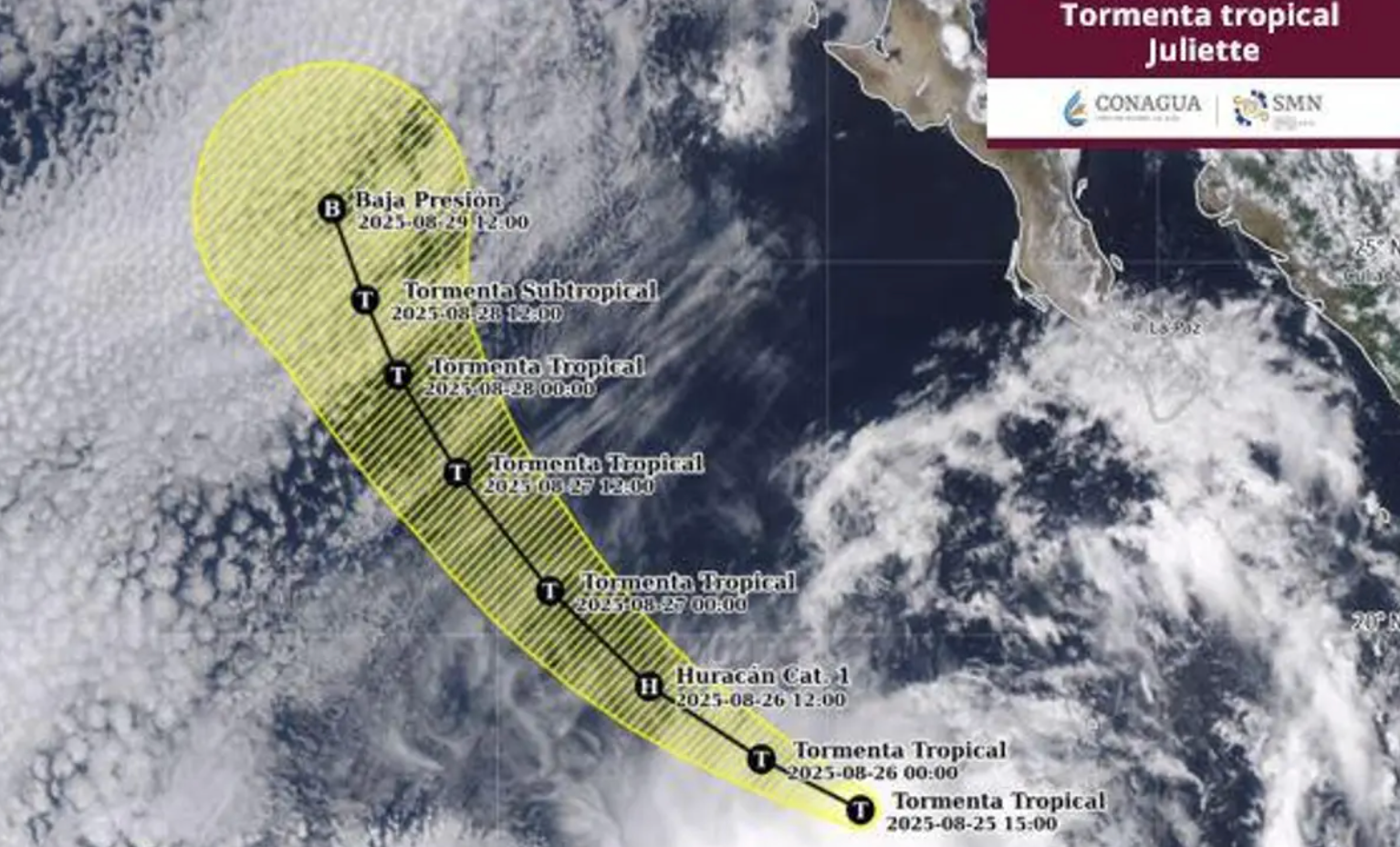 Ciudad de México.- El Servicio Meteorológico Nacional (SMN) de la Comisión Nacional del Agua (Conagua) confirmó la formación de Juliette, la nueva tormenta tropical de la temporada en el océano Pacífico.