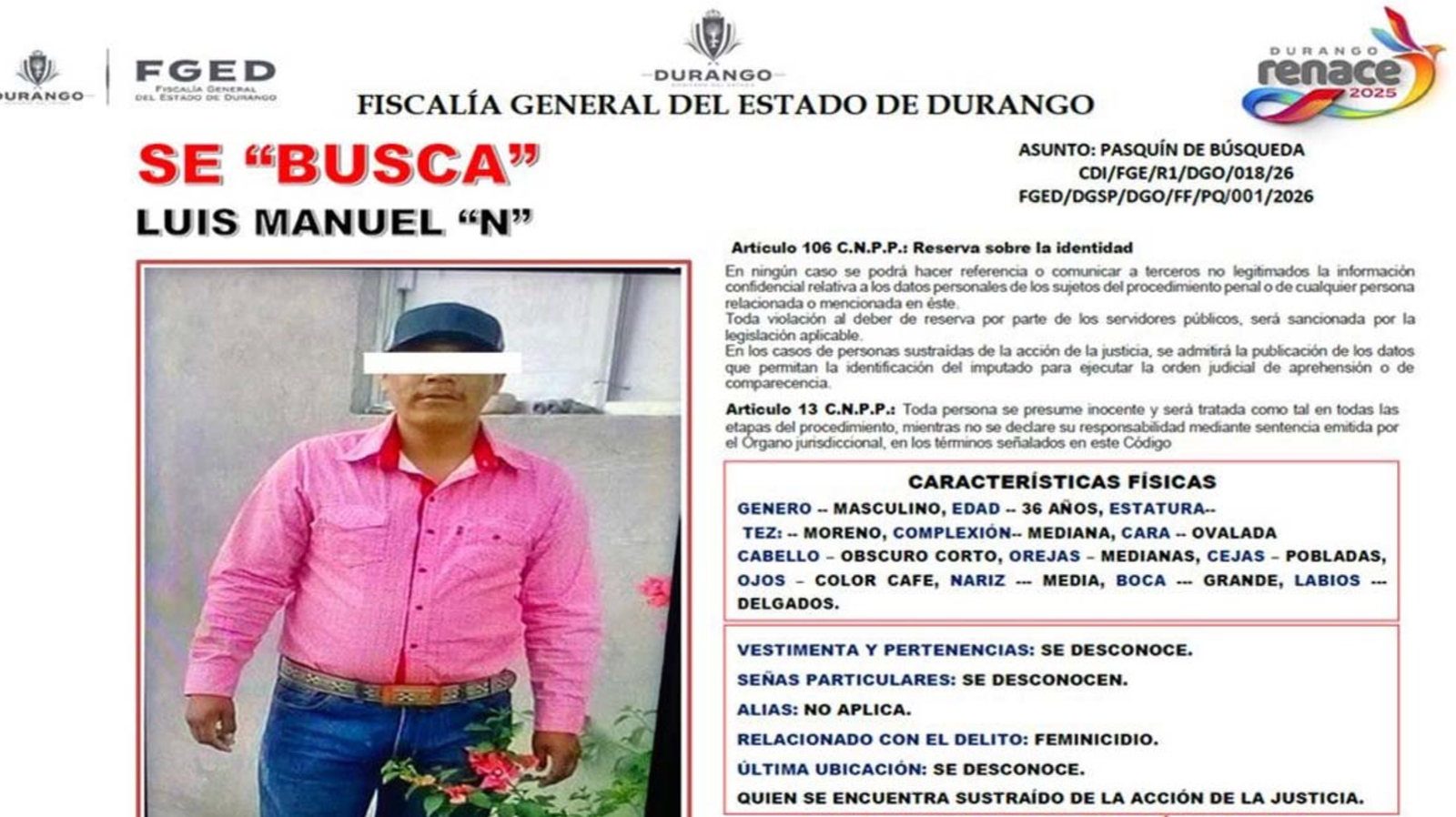 La Fiscalía General del Estado de Durango (FGED) emitió una ficha de búsqueda para localizar a Luis Manuel “N”, señalado como presunto responsable del feminicidio de Marisol Gutiérrez, de 33 años de edad, ocurrido en el municipio de Ocampo. Se trata del segundo caso de feminicidio registrado en la entidad en lo que va de 2026.