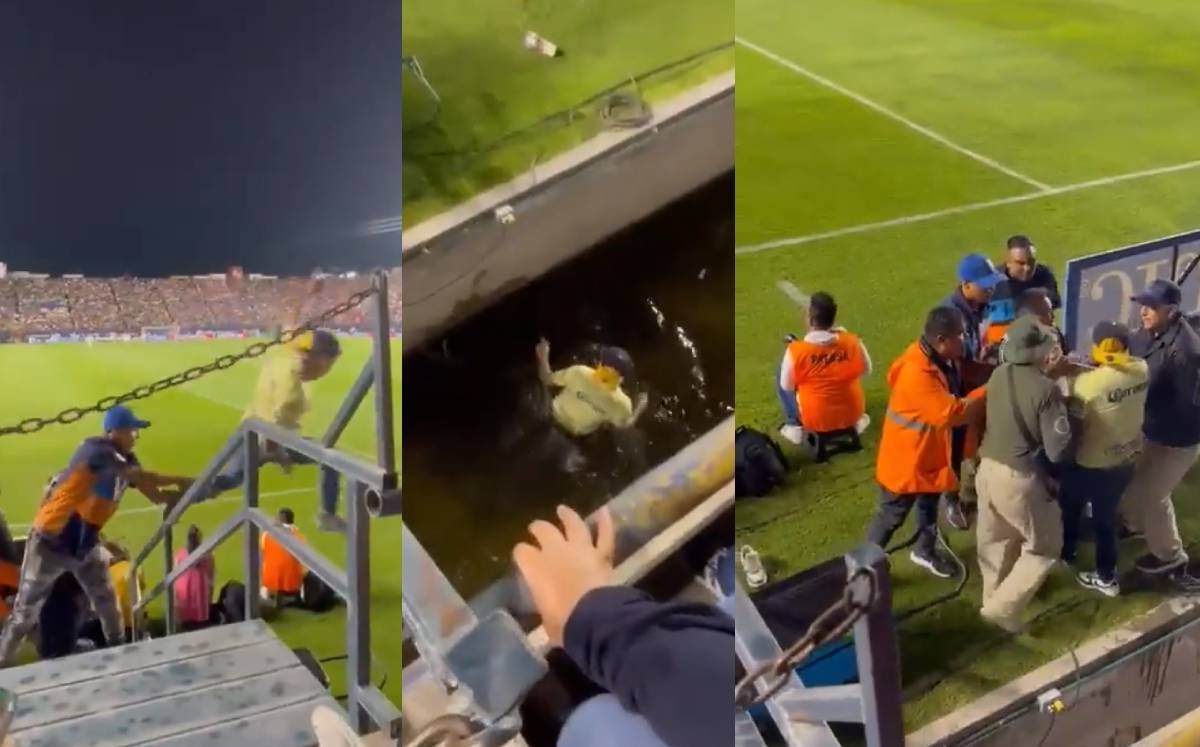 El hombre terminó en el suelo pero cayó hasta el canal del estadio, por lo que terminó bañado de agua la cual no estaba nada limpia.