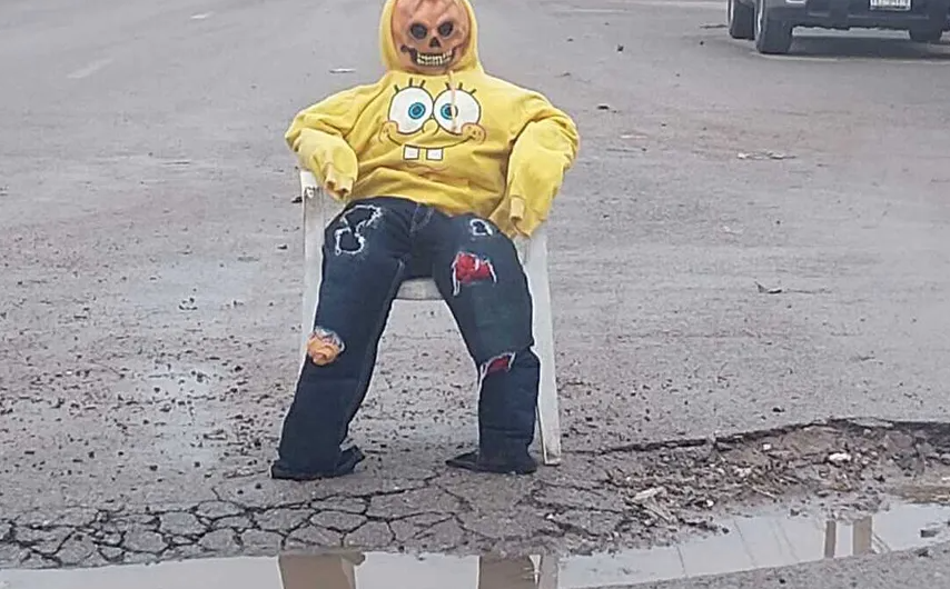 Colocaron un muñeco vestido con una máscara terrorífica, pantalones de mezclilla y una sudadera de Bob Esponja junto al bache.