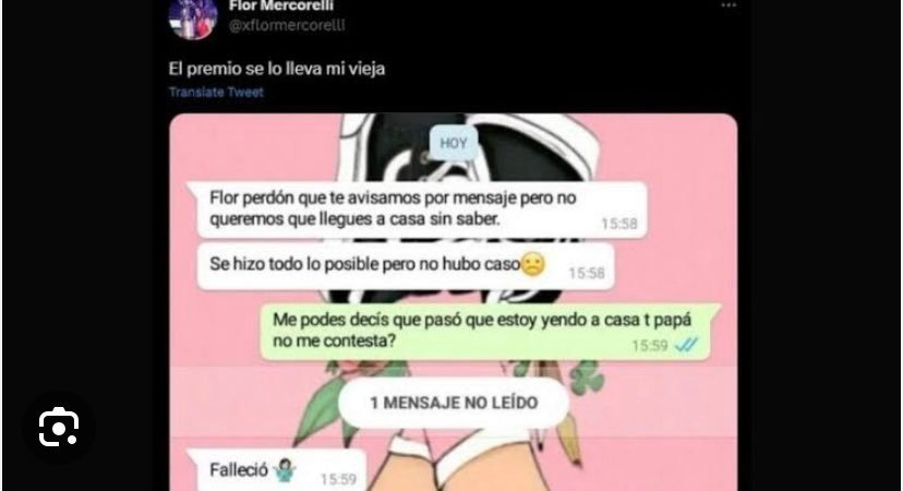 «Flor, perdón que te avisamos por mensaje, pero no queremos que llegues a casi sin saber. Se hizo todo lo posible, pero no hubo caso», se lee en el mensaje que la madre le envía a Florencia. El mismo está seguido de un emoji con una carita triste.