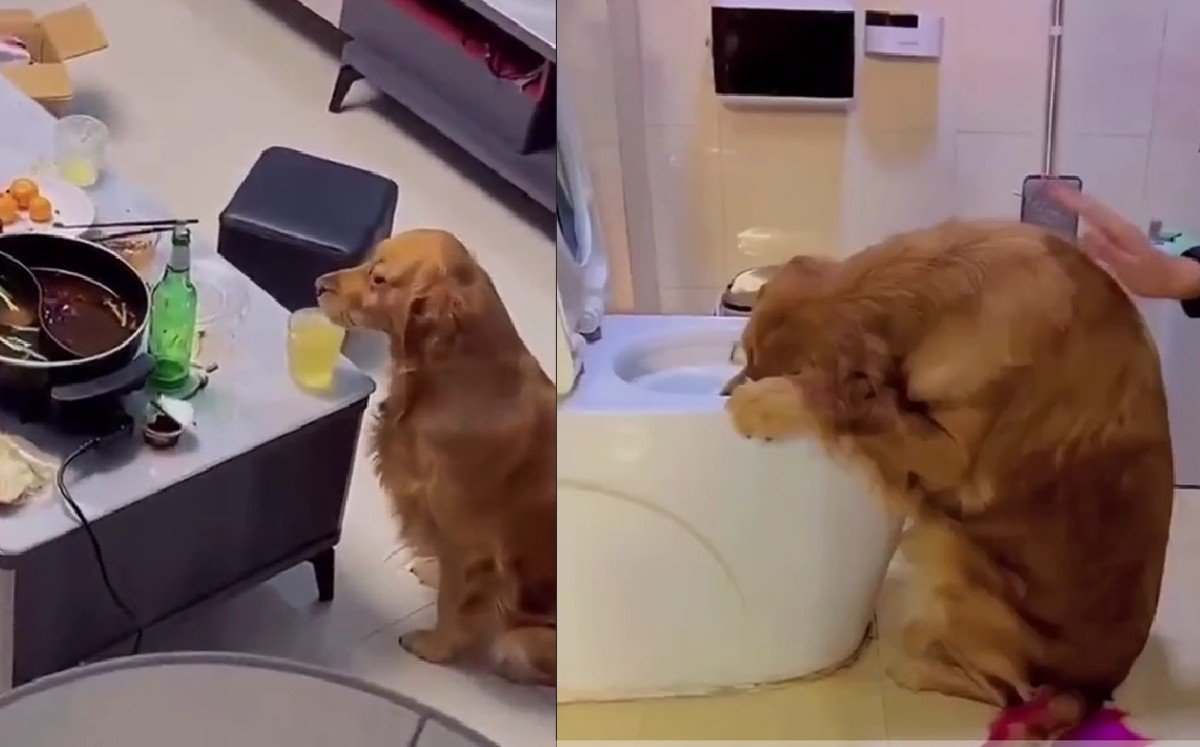 El usuario alexchoj97 compartió el video donde se ve primero al perrito bebiendo rápidamente del vaso, para después cambiar a una toma del mismo animalito, esta vez en la taza del baño, ya que parece que la bebida no le sentó para nada bien.